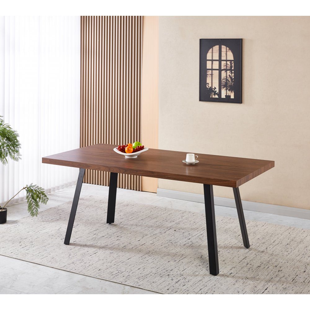 Algot matbord med ett modernt underrede i svartlackad metall. Matbordet har en massiv bordsskiva i MDF med mörkbrun ekfoliering. Matbordet har plats för 6 till 8 personer.