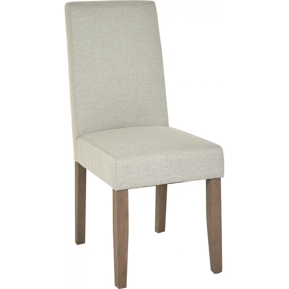 Axel matstol i ett klassiskt utseende. Stoppad rygg och sits för skön komfort. Tyget är ljus beigegrått med fiskbensmönster. Ben i brunt trä.