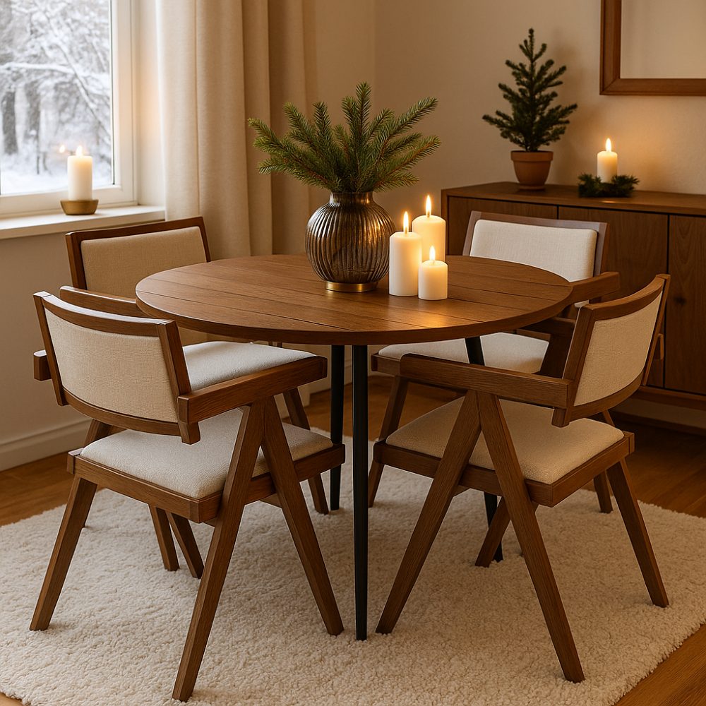 De fyra Sara karmstolarna tillför en tidlös och harmonisk känsla till helheten. Stolarna är tillverkade i FSC-certifierat massivt trä med valnötsfinish och har sits och rygg klädda i linnefärgat tyg som ger en mjuk, naturlig balans. Kombinationen av träets värme och tygets behagliga ton skapar en inbjudande och stilren atmosfär kring matplatsen.