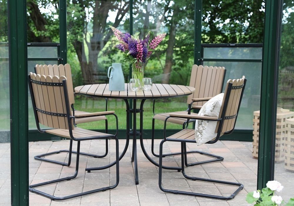 Holmsund är en klassisk utegrupp, tillverkad av brunmönstrad aintwood och stomme av hållbar svart metall. Detta gör utegruppen väderbeständig och tålig för att klara uteplatsens miljö. Gruppen har en skandinavisk design.