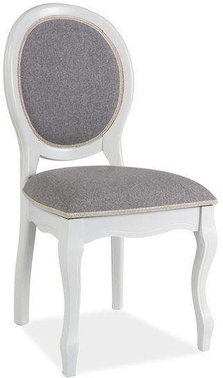 En fin matstol med en klassisk design. Stommen är tillverkad av vitmålad trä och sitsen är klädd med ett mycket behagligt tyg för maximal komfort.