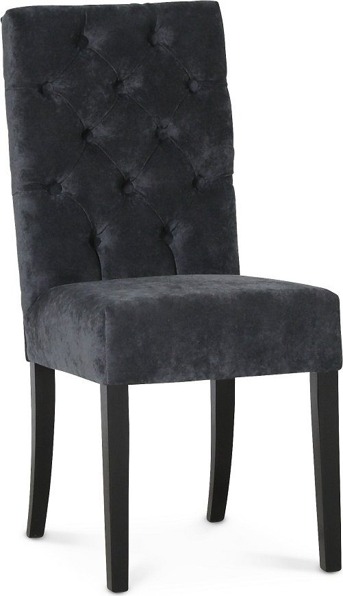 Matstol från Skånska Möbelhuset i massiv svarta träben, Sits och rygg klädd i ett mörkgrå sammetstyg. Ryggen är med djuphaftade knappar för att ge en exklusiv känlsa och utseende.