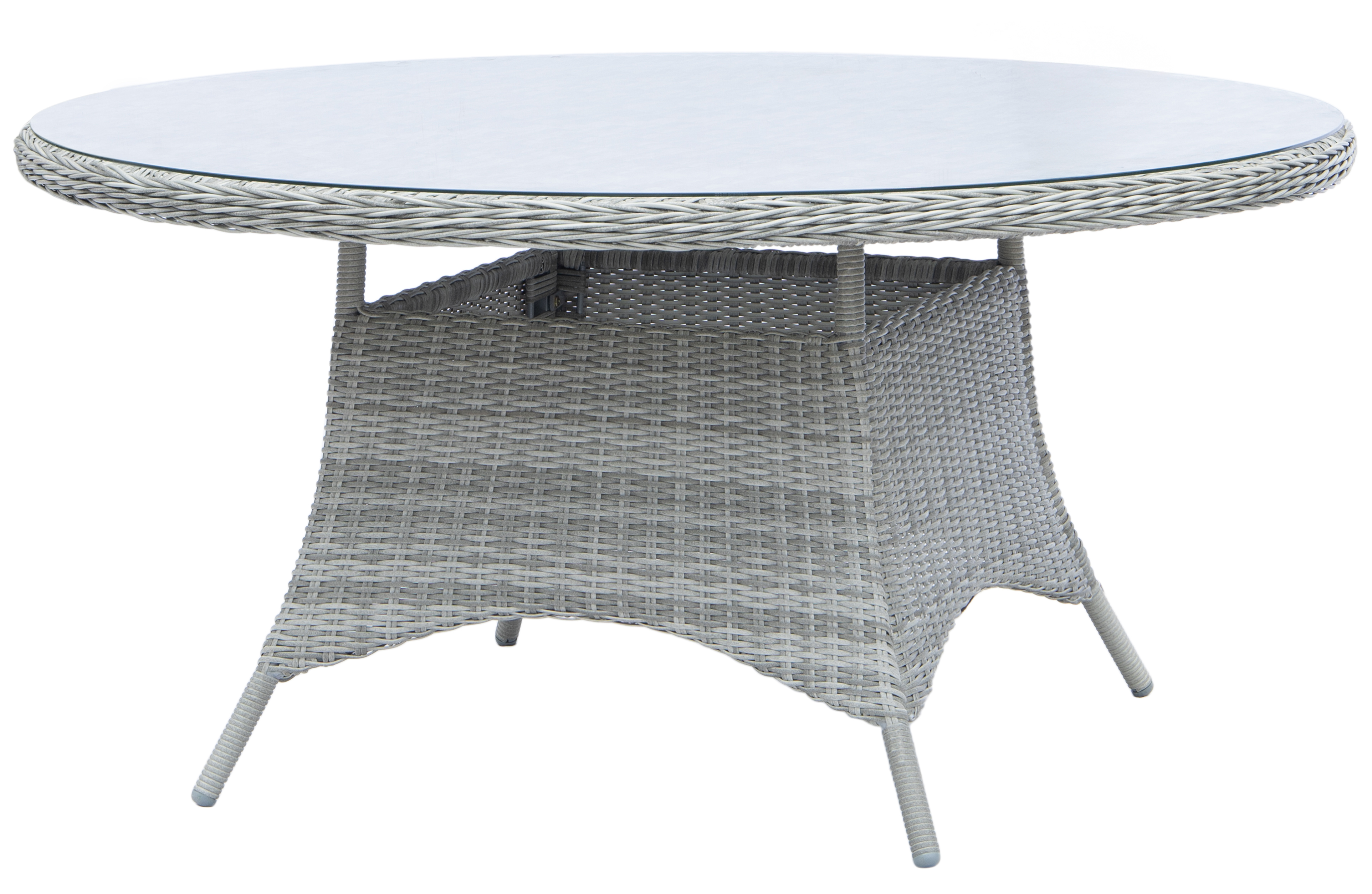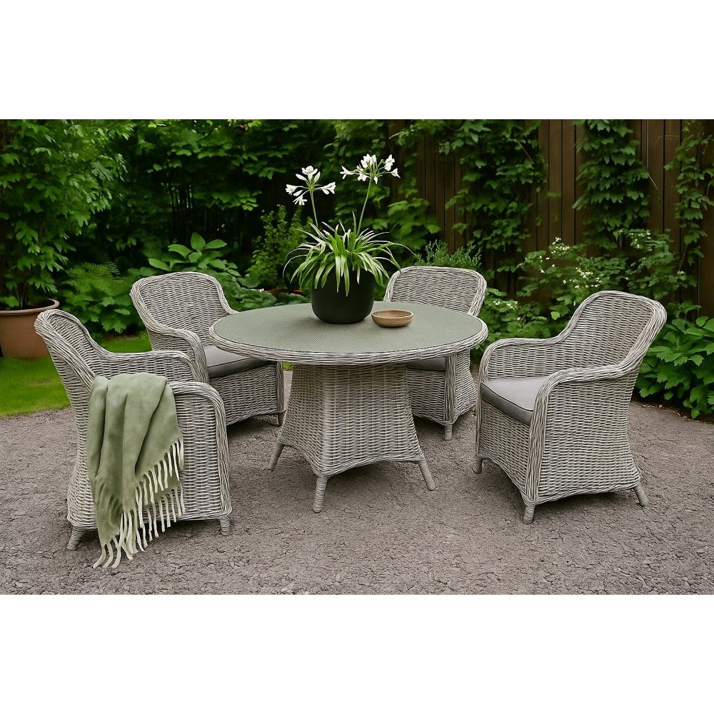 Matgrupp; 4 stolar och matbord Ø110 cm grå/rotting
