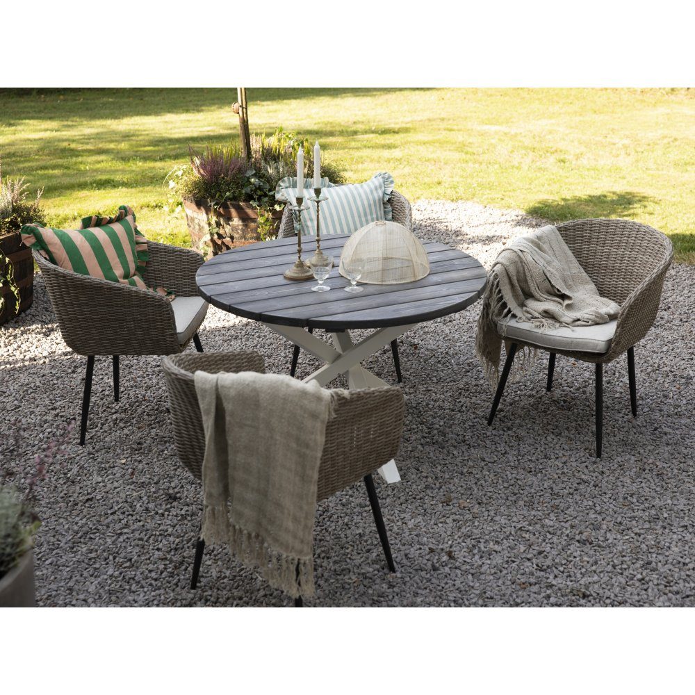 Utegrupp Aster: Scottsdale runt grå/vitt matbord Ø112 cm inklusive 4 st Aster karmstolar med sittdynor. En matgrupp i harmoni där möblerna går snyggt ihop och skapar en helhet som är svåröverträffad. Passar lika bra i uterummet som på gräsmattan.