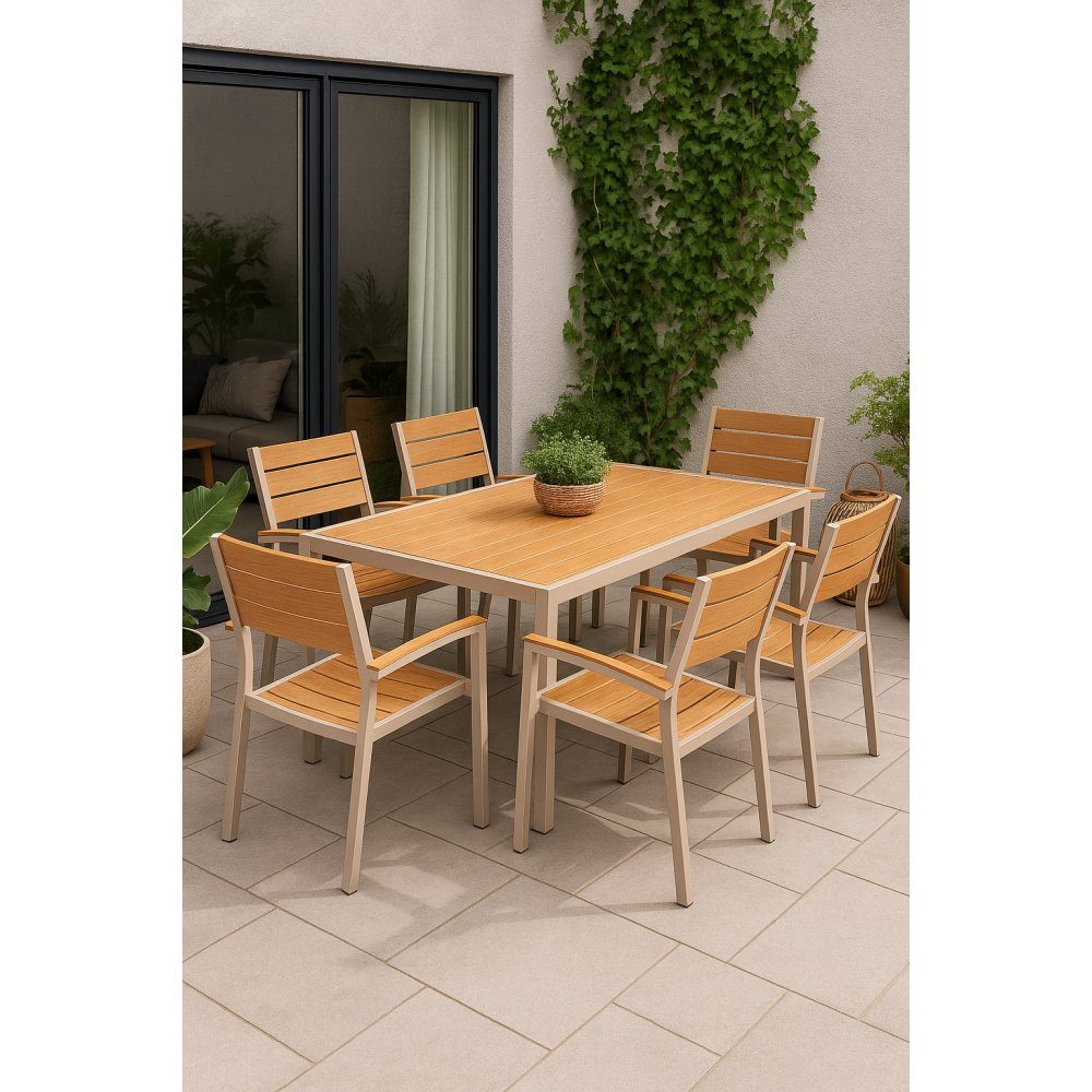 Skapa en trivsam plats för sommarens måltider med en matgrupp i tåliga och lättskötta material. Det rejäla matbordet har en slitstark bordsskiva i aintwood och en stabil stomme i beige aluminium. Bordets naturliga färgtoner och stilrena design passar perfekt för både altan och uterum och kräver minimalt underhåll.