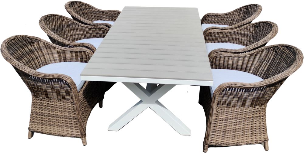 Stor och rymlig matgrupp för uteplatsen, stolar i ljusgrå/brun konstrotting med gråbeige sittdynor. Bord av gråpolywood med kryssben i vit aluminium för att ge en stabil känsla och ett väderbeständigt uteset.