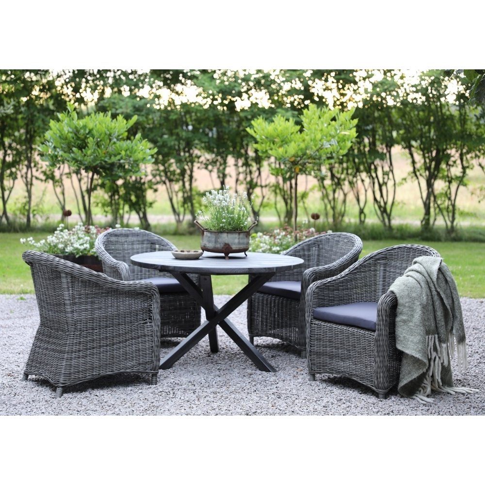 Matgrupp till utemöblemanget. Runt bord i grålaserad furu med kryssben samt 4 st Mercury light fåtöljer i grå konstrotting med dynor. En matgrupp i harmoni där möblerna går snyggt ihop och skapar en helhet som är perfekt för både uterum och altan. Bordet har behandlats för att få den patina man förknippar med Shabby Chic. Eftersom detta arbete sker för hand får varje exemplar ett unikt utseende.