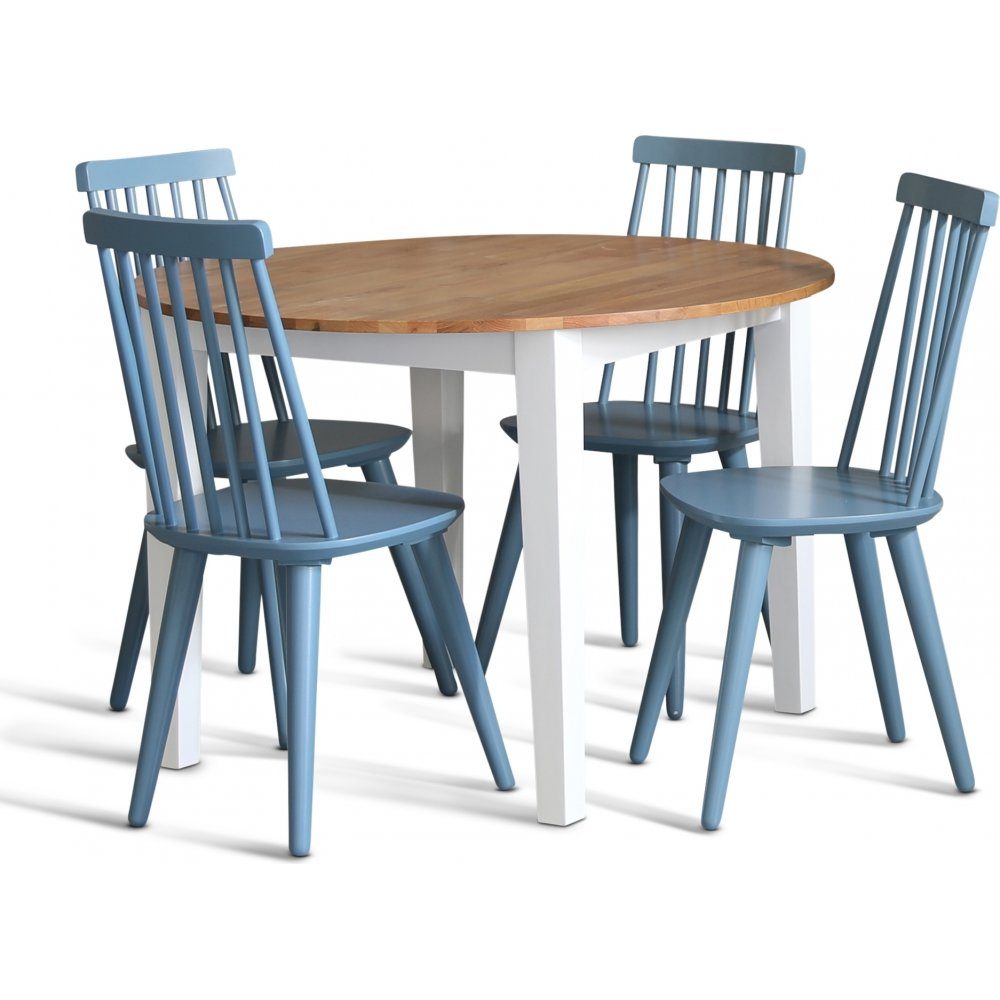 Dalsland matgrupp med runt matbord med toppskiva i oljad ek och vitlackat underrede. Dalsland pinnstolar i en läcker duvblå lack (RAL5007)