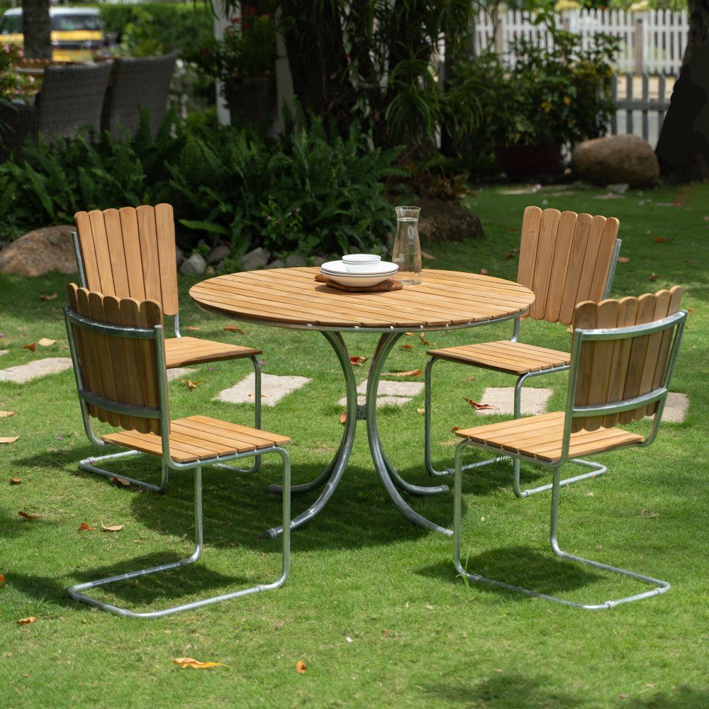 Möllan utegrupp i teak: 4 st stolar med matbord Ø110 cm