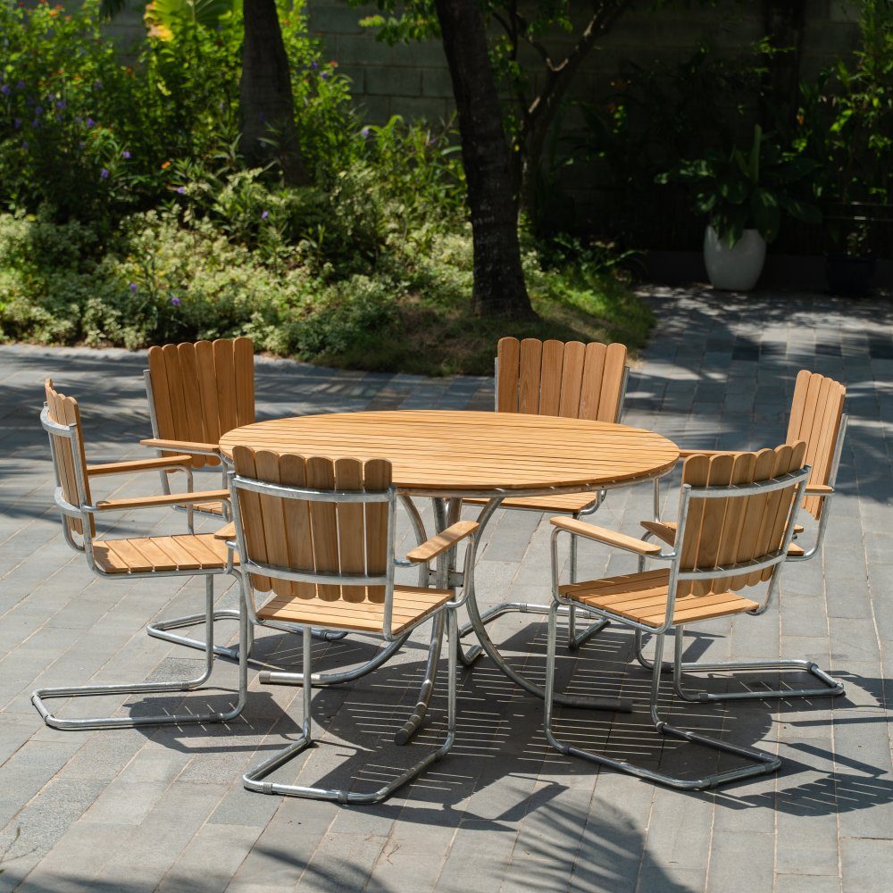 Möllan utegrupp i teak: 6 st karmstolar med matbord Ø130 cm