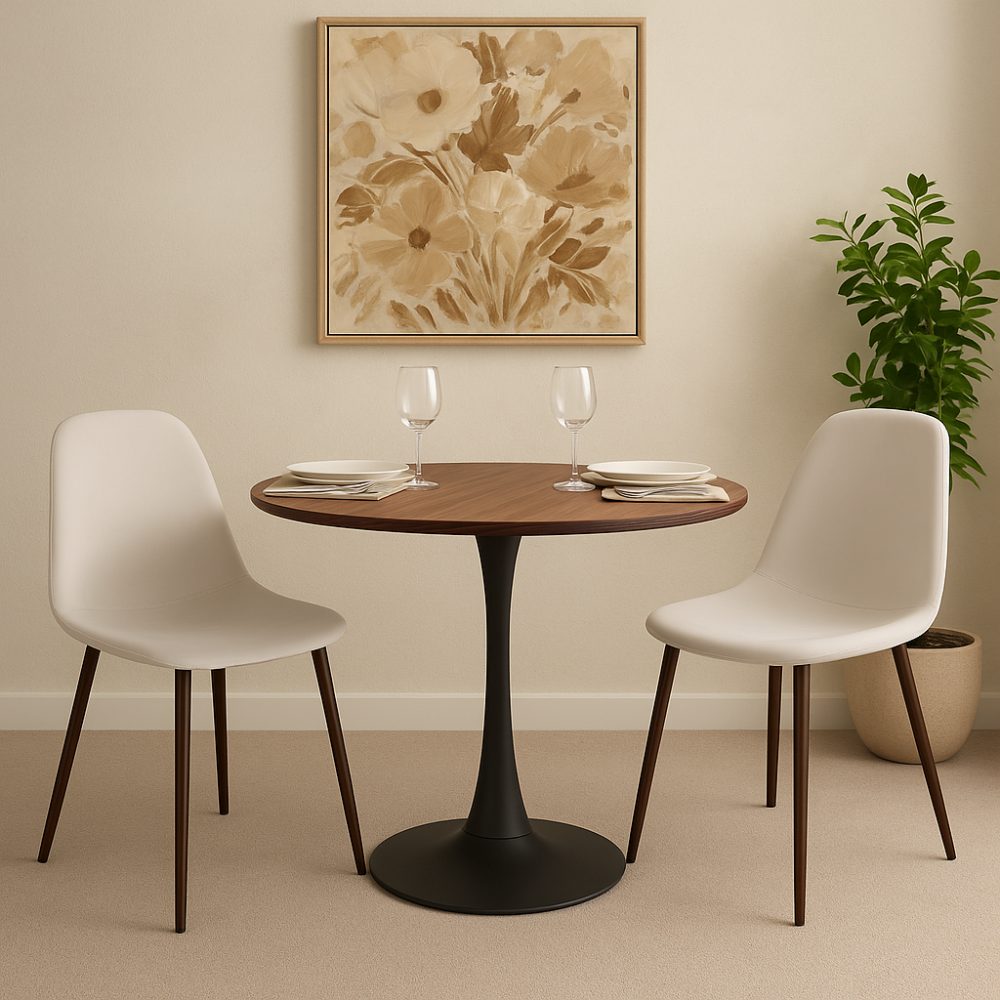 Matgruppen Olmo & Alfred är en stilren och kompakt kombination som förenar modern design med varma, eleganta material. Det runda Olmo matbordet har en bordsskiva i laminerad MDF med vacker valnötsfinish och ett svart pulverlackerat stålunderrede i pelardesign, vilket ger både stabilitet och ett tidlöst uttryck. Den nätta storleken gör bordet perfekt för mindre kök, matplatser eller som ett mysigt frukostbord.