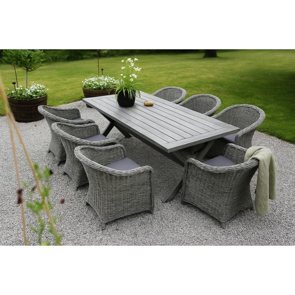 Oxford utematgrupp; grått bord 220 cm inkl 6 st Mercury fåtöljer grå konstrotting