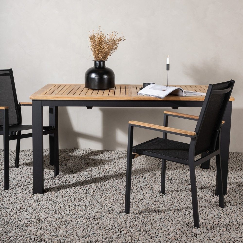 Smart, stilrent och slitstarkt matbord - vad mer kan man önska för sommarens utomhusmåltider? Panama är ett förlängningsbart matbord i rektangulär form. Bordsskivan är i vackert teak och underredet i svart metall; två enkla och tåliga material som ger dig ett hållbart matbord. Den praktiska storleken gör att bordet fungerar utmärkt för både små och stora sällskap. Så gör dig redo för sommarens uteliv och skapa en charmig mittpunkt på uteplatsen att samla familjen kring! Skötselråd: Våra teakmöbler produceras av certifierad teak som är odlad för ändamålet och inte skövlade från ömtålig regnskog. Som ett av de tåligaste träslagen innehåller teak mycket olja som sedvanligt behövs för att inte materialet ska spricka. Eftersom träslaget innehåller naturligt mycket behöver inte möblerna impregneras lika ofta.