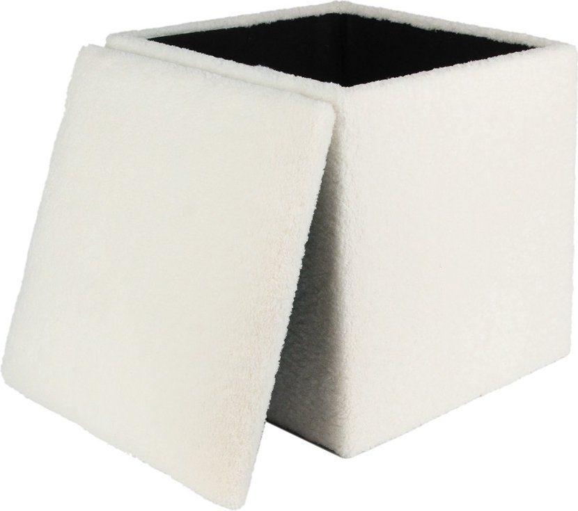 Petit fyrkantig fotpall med förvaring. pallen är klädd i ett mjukt vitt teddy material.