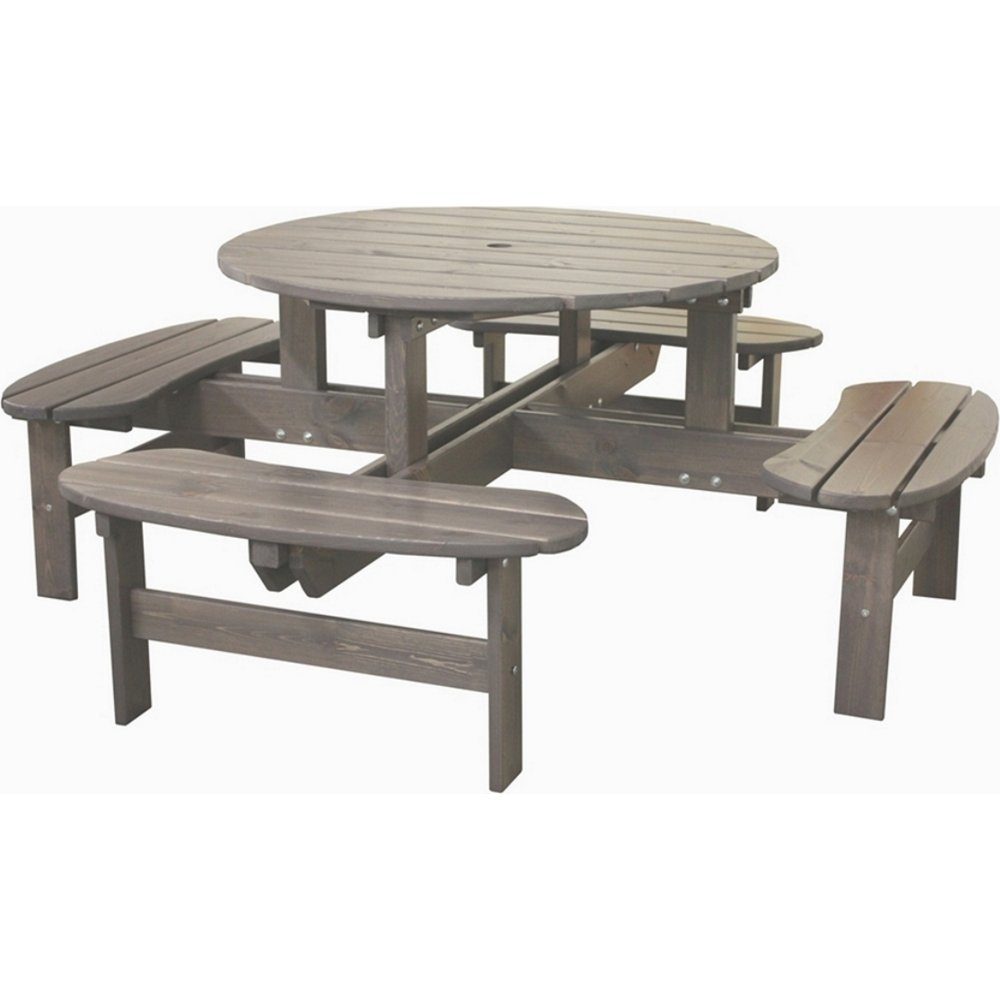 Ronda är en cirkelformad praktisk bänk med bord där man praktiskt kan sitta ner och äta eller annat. Robust i grålaserad furu, förbered för parasoll.