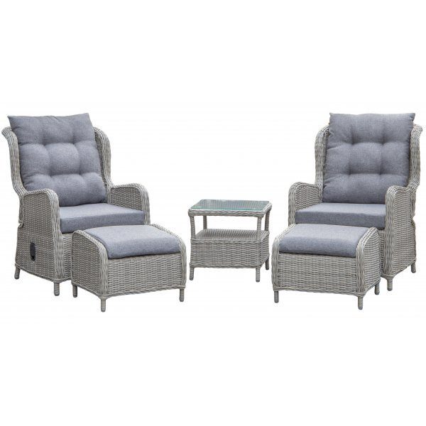Santiago loungeset bestående utav 2 st bekväma fällbara fåtöljer med fotpallar i grå konstrotting med grå dynor. Till setet ingår även ett litet Santiago bord i matchande konstrotting.