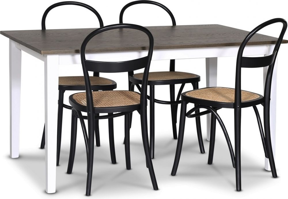 Skagen matgrupp från Skånska Möbelhuset, klassiskt matbord 140 cm med vitt underrede och en toppskiva i brunbetsad ekfanèr. Det ingår 4 stycken matchande Danderyd matstolar i svartlackad trä med rottingsits.