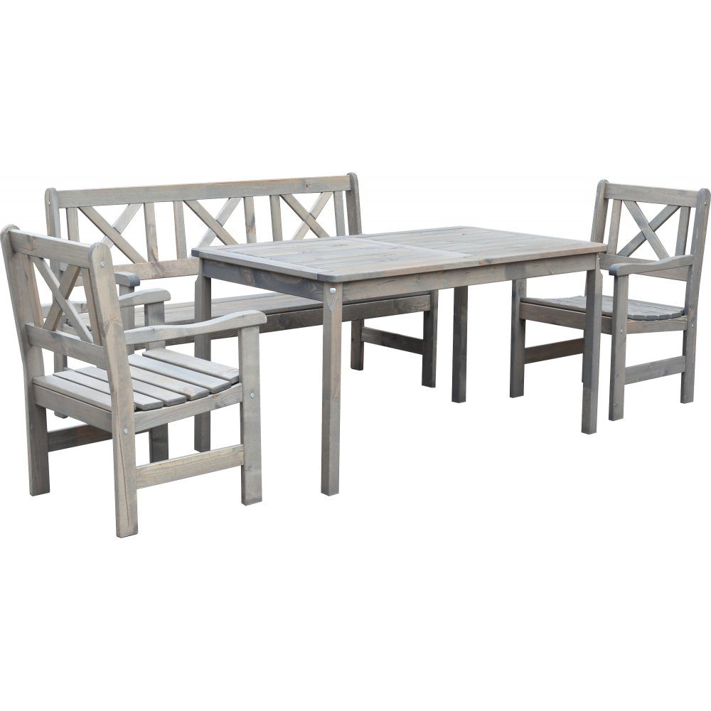 En soffgrupp från Bollnäs-serien som har ett klassikt utseende med en lantlig stil som passar på de flesta verandor, terasser och uteplatser. Soffgruppen består utav en bänk, ett bord och två fåtöljer. Dynor ingår ej.