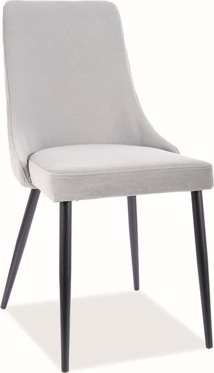 Stol klädd i ett mjukt grått tyg med svarta metallben.