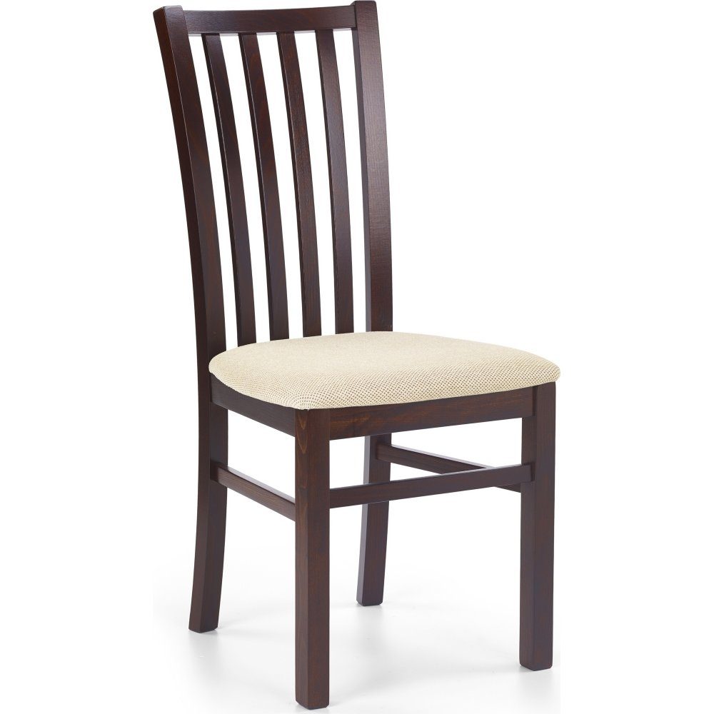 En klassisk matstol med en stilfull design. Tillverkad i massiv bok med ett härligt valnöts utförande och sitsen är klädd med ett mycket behagligt beige tyg för den maximala komforten.