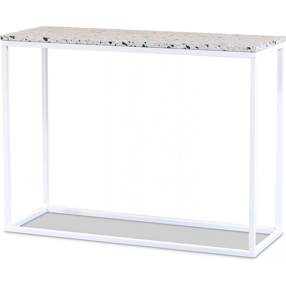 Terrazzo konsolbord med en cosmos terrazzo stenskiva (Ljus botten med svarta, bruna och grå stenar i) och vitlackat metallunderrede.