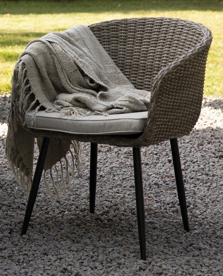 Aster är en lätt och stilfull matstol som skapar en inbjudande atmosfär på altanen, i trädgården eller i uterummet. Den naturfärgade konstrottingen tillsammans med svarta metallben ger en vacker balans mellan klassisk charm och modern design. Tack vare den medföljande beige dynan får du en bekväm sittplats för långa, avkopplande stunder i solen.