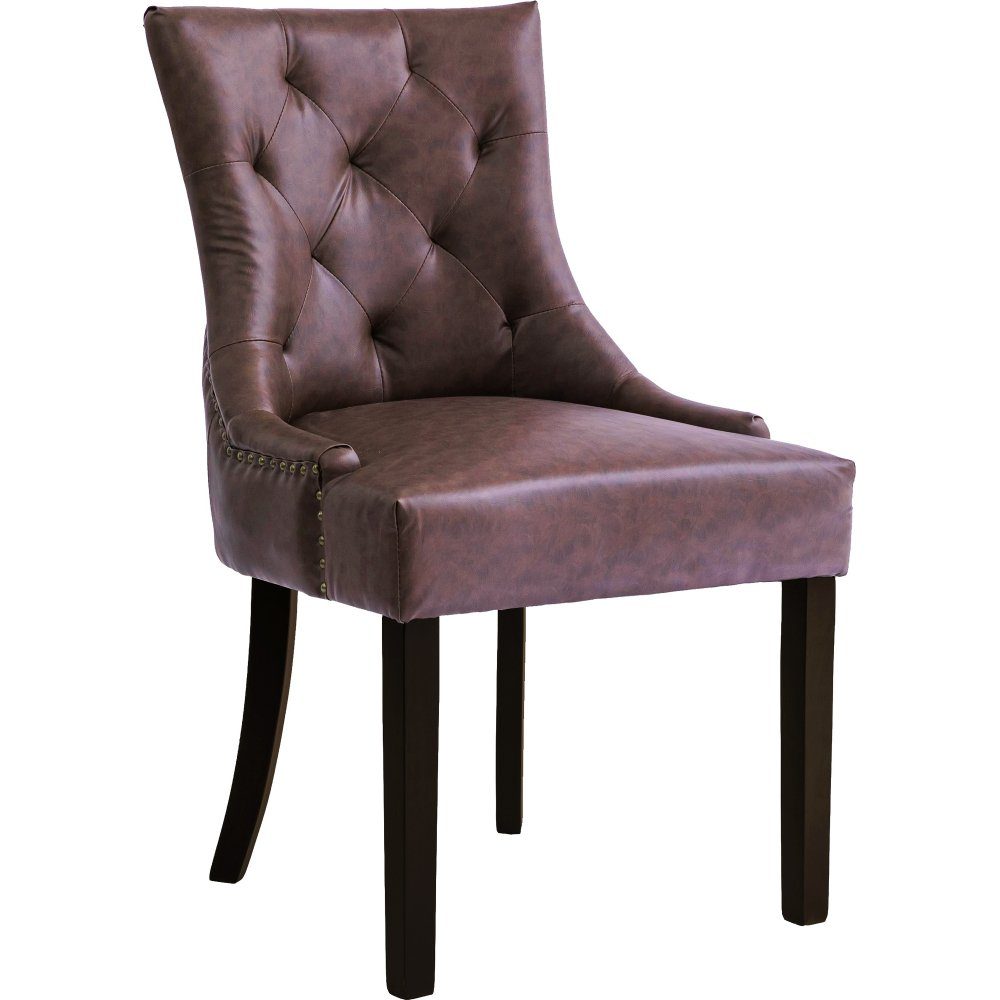 Matstol som kombinerar tidlös stil med modern komfort. Klädd i brunt vintage PU-läder och med matchande bruna ben, ger den en varm och inbjudande känsla till ditt matbord. De antikfärgade nitarna är en smakfull detalj som ger stolen en rustik charm och accentuerar dess klassiska design. Med sin välarbetade konstruktion är Tuva en av våra mest populära matstolar, perfekt för både vardagligt bruk och mer festliga tillfällen. Ge din matsal en sofistikerad touch med Tuva-stolen!