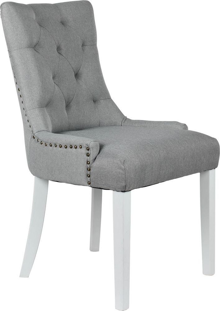 Tuva-stolen är en elegant och stilren matstol, klädd i ett trendigt grått tyg som ger en modern touch till din inredning. Med sina vita ben som står i kontrast till det mörka tyget skapar stolen en ljus och luftig känsla i rummet. Nitarna i antikfärg ger stolen en vacker detalj som inte bara är visuellt tilltalande utan också tillför en känsla av hantverk och karaktär.