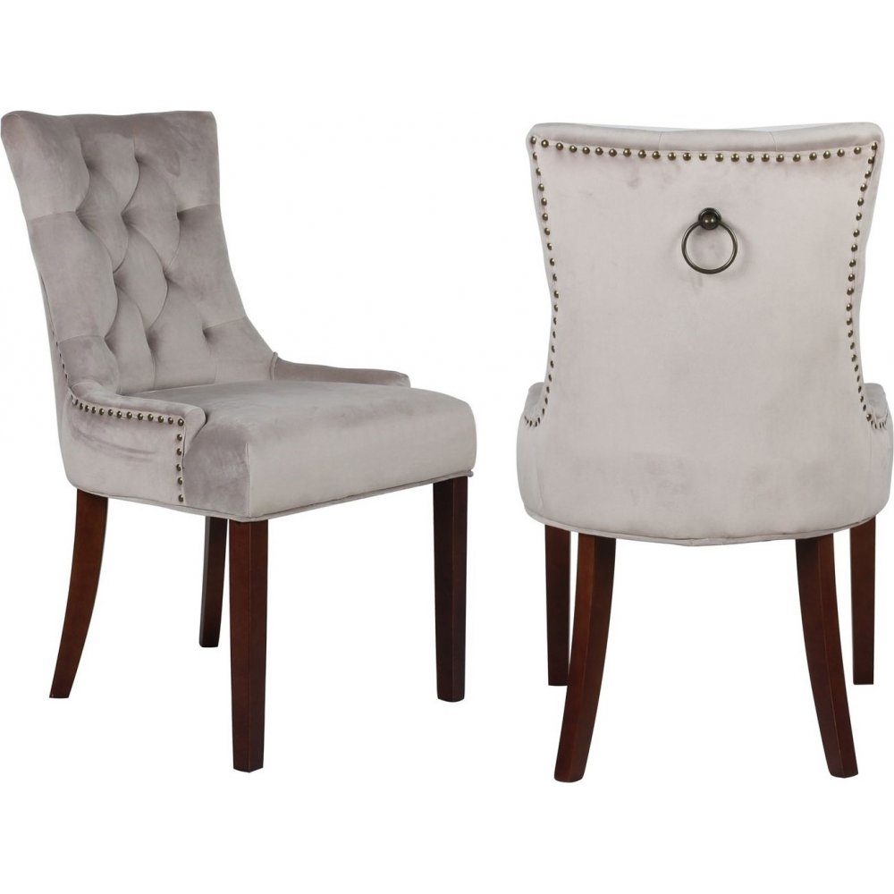 Tuva-stolen är en tidlös klassiker som kombinerar elegans och komfort för att lyfta din matplats till en ny nivå. Klädd i mjuk gråbeige sammet och utsmyckad med antikfärgade nitar, är denna stol ett stilfullt inslag i både moderna och klassiska inredningar. Det dekorativa ringhandtaget i ryggen adderar en lyxig detalj, medan de bruna, robusta benen i heveaträ skapar en vacker kontrast.