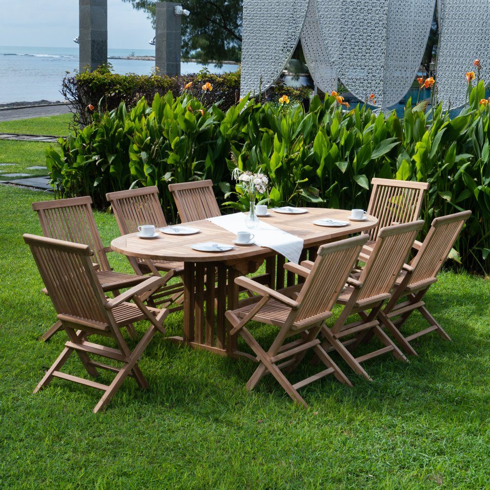 Saltö matgrupp för uteplatsen med ett förlängningsbart matbord i massiv teak, tillsammans med 8 stycken Saltö karmstolar i massiv teak. En modern kombination på uteplatsen.