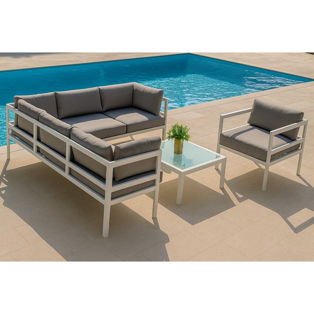 - Utegrupp med bord och hörnsoffa i vit aluminium