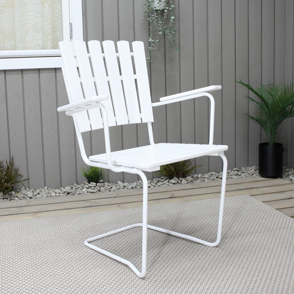 Klassisk stol för uteplatsen från Skånska Möbelhuset. Modern i vit med nätt stomme i metall.