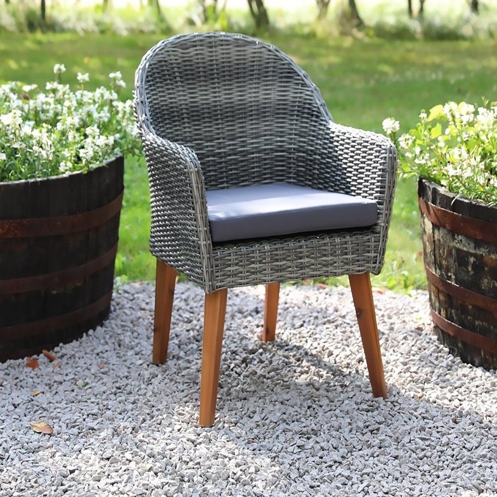 Matstol för uteplats och uterum i stilren design med cementfärgad, gråmelerad konstrotting. Stolen har en bekväm och tålig sittdyna i matchande mörkgrått tyg som ger extra komfort vid sommarens måltider utomhus.