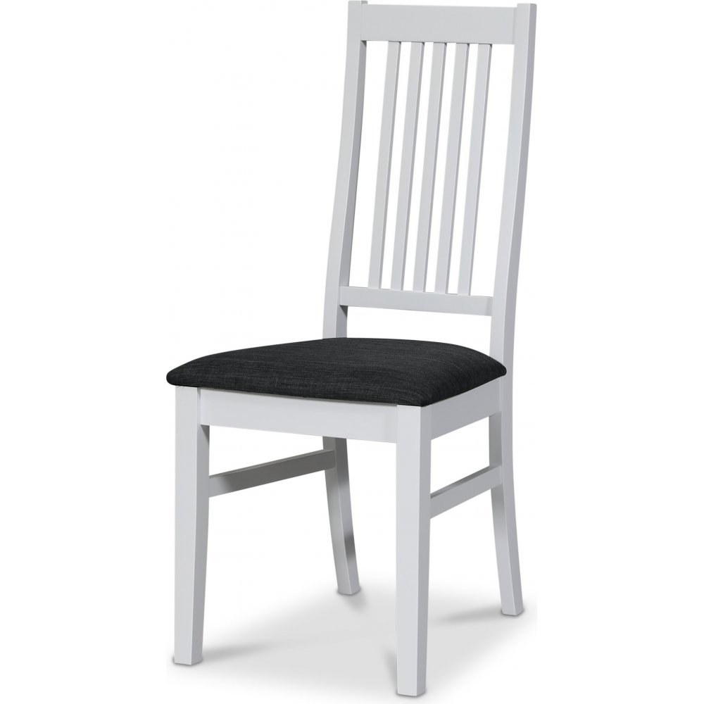 Klassiskt matgrupp, bord med underrede och toppskiva av massivt vitlackat trä. Modern stol i massivt heveaträ, vitlackad med sits av grått tyg.