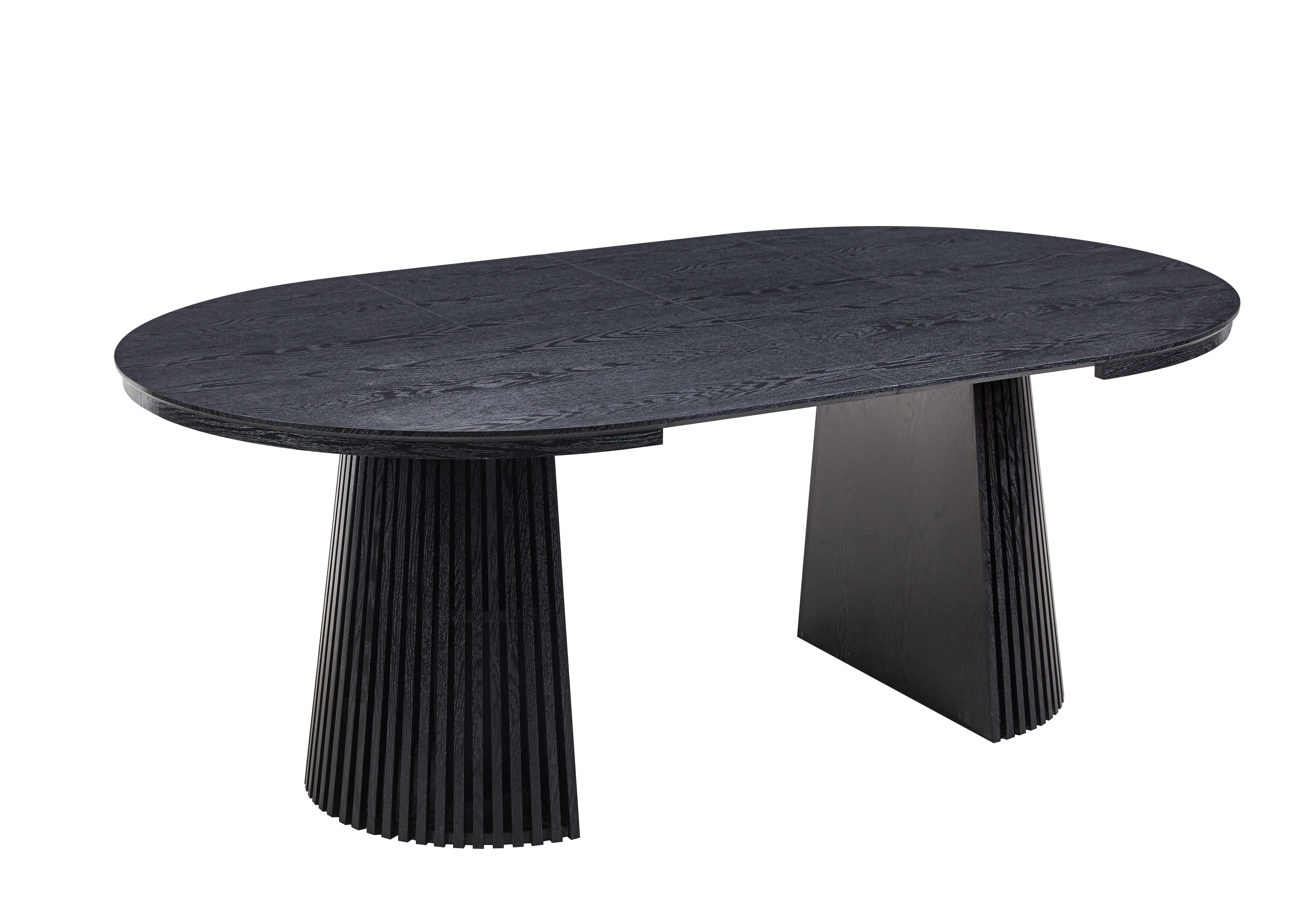 En modern och flexibel matgrupp som kombinerar stilren design med praktisk funktion. Crossby matbord har en rund bordsskiva i svartbetsad ekfolierad MDF och dekorativa räfflade bordsben i trä, vilket ger ett elegant och samtida uttryck. Bordet är förlängningsbart och kan enkelt dras isär för att rymma fler gäster – tack vare de två medföljande iläggsskivorna à 50 cm kan bordet utökas från 120 cm till hela 200 cm i längd. Perfekt för dig som vill kunna anpassa matplatsen efter behov, från vardagsmiddag till fest.